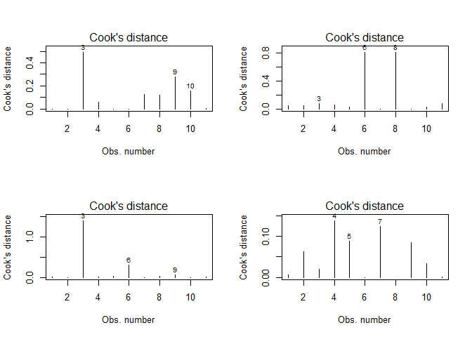 You might wonder why some of the points in the above figures are labled (e.g. 3, 9, 10 in the upper left plots). This “feature” results from a influential points analysis using Cook’s distance which is a measure of how strong the regression parameters change if a certain observation is not considered. Hence, the larger this change, the larger the influence of this particular observation. For the above data, Cook’s distance looks like that: