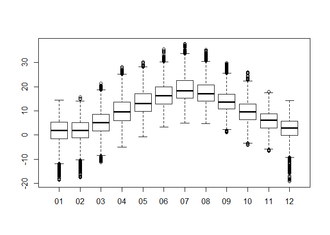 As one can see, there is a clear annual pattern (surprise, surprise). To have a closer look on this pattern, one simple option would be a set of boxplots showing the variation within each month over the entire dataset. To do so, the data in the boxplot has to be grouped by months, what requires a list indicating the class (i.e. month) each temperature record belongs to. The easiest way is to create an additional column in the data frame and copy the characters which define the month in the original date column to it.