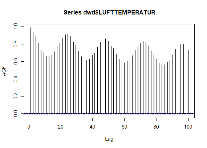 Since we have more than 80.000 values available, we can use a maximum lag of 100 although this is done mainly for illustration purposes. Obviously, we have strongest correlations at lags of 24 (i.e the correlation between hourly temperatures is highest if the temperatures are meassured at the sime time of day). While this holds true, the absolute correlation decreases if the number of days between the observations increases.