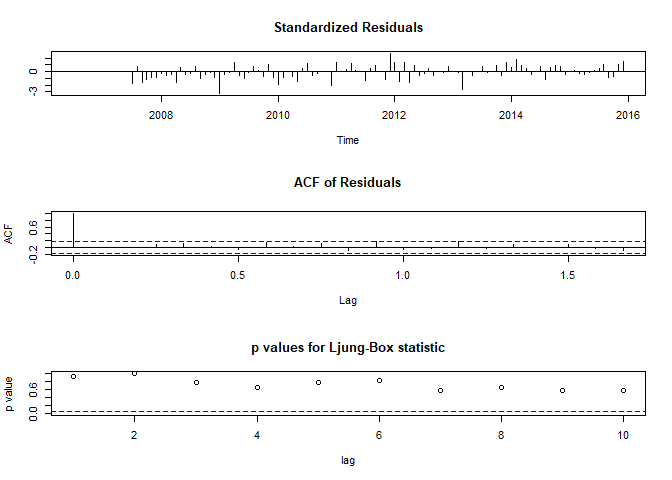 Not perfect but good enough to be used in this example. Before we run the ARIMA model, we run a simple AR model first: