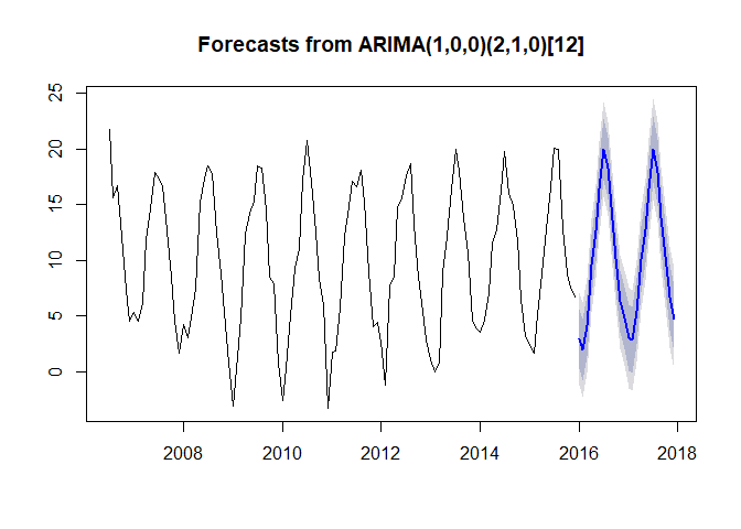 In order to predict the time series just based on its observed dynamics, an auto-regressive integrated moving average model (ARIMA) can be used. ARIMA is not a diagnostic model for the identification of seasonal or other periodic components. On the contrary, it requires a stationary time series, which is a prerequisite we already know is not true for the monthly mean air temperature values between July 1st 2006 and December 31st 2015.