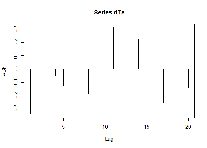 ## ar(x = dTa, aic = TRUE, order.max = 20, method = "yule-walker")