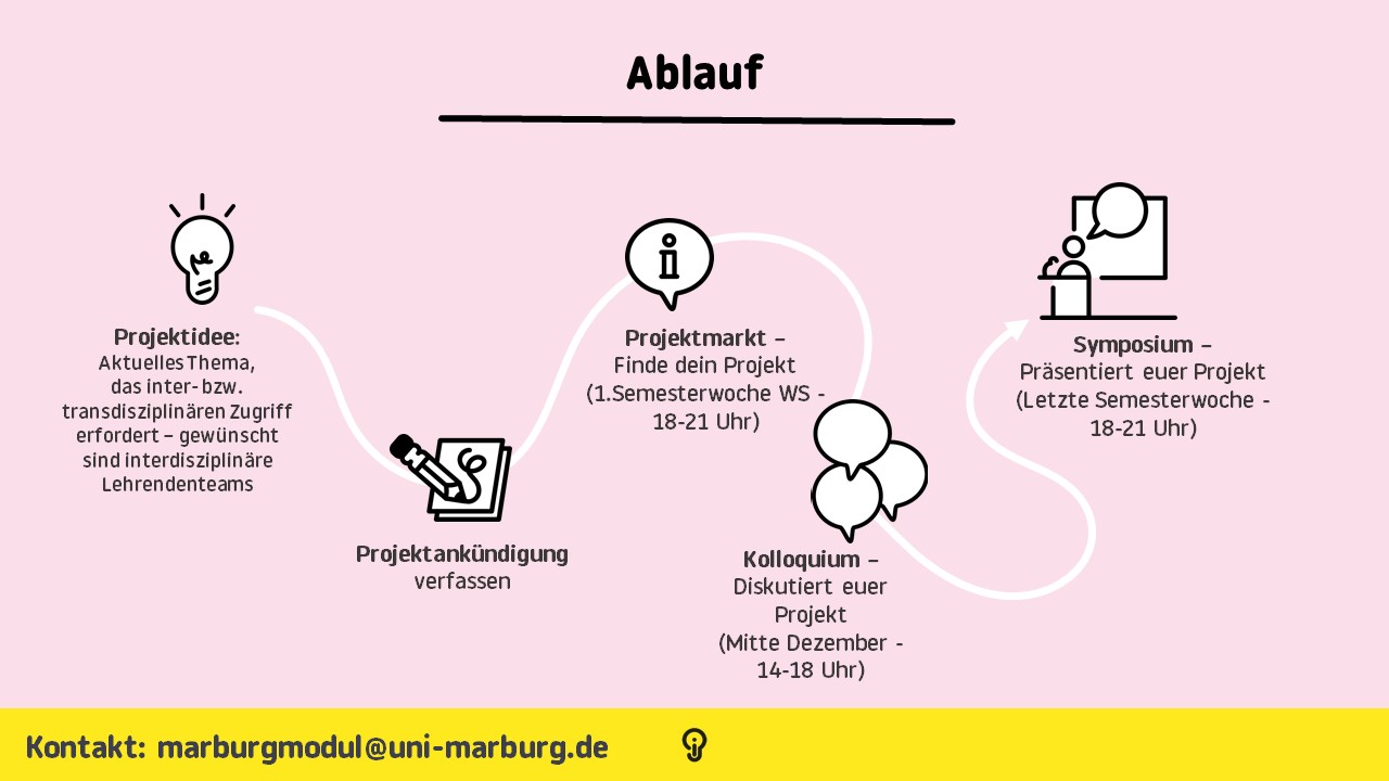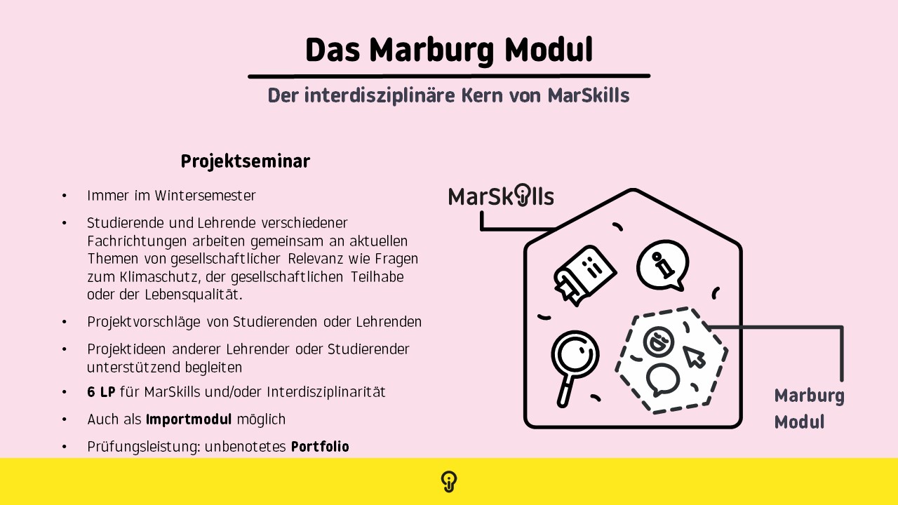 Im Marburg Modul wollen wir Studierenden ermöglichen, sich aktiv und kreativ mit dem Thema auseinanderzusetzen. In Kleingruppen kann nach eigenen Stärken und Interessen dazu beigetragen werden.
