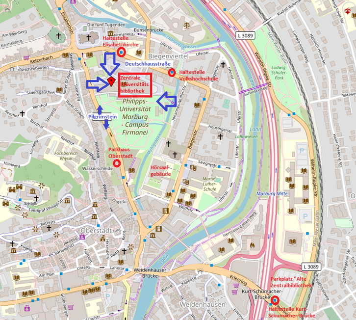 Gegenüber des Gebäudes befindet sich das Parkhaus Oberstadt (Pilgrimstein 17), in dem Sie kostenpflichtig für einen Tageshöchstpreis von 14 Euro parken können. Der Parkplatz an der alten Zentralbibliothek (Wilhelm-Röpke-Straße) steht Ihnen allerdings ebenfalls kostenfrei zur Verfügung. Von dort (Bushaltestelle Kurt-Schumacher-Brücke) fährt die Buslinie 9 direkt zur Universitätsbibliothek. Nehmen Sie dann den Ausstieg "Volkshochschule".