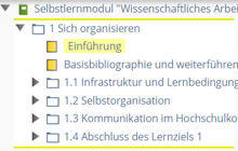 Ausgewählte Lernziele werden gelb hervorgehoben. Sie werden ausgeklappt, sodass die Inhalte sichtbar werden. In diesem Kurs sind nur die Lerninhalte, nicht aber die zu den Lernmodul gehörenden Tests sichtbar. Um zu gewährleisten, dass Lernende sich erst mit den Inhalten befassen, wurden die Tests ausgeblendet und sind nur über die jeweils letzte Seite des zugeordneten Lernmodulkapitels verlinkt.