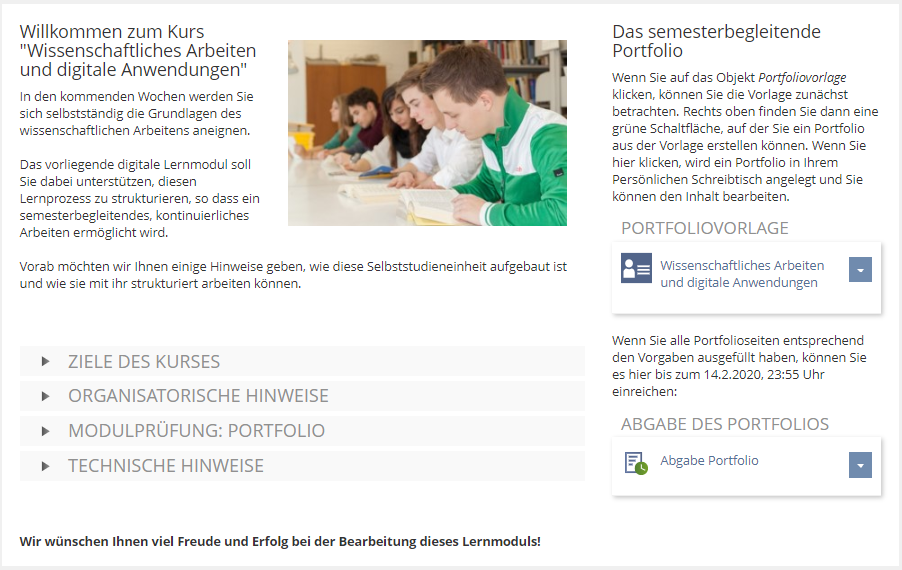 Mithilfe des Objekts "Materialienliste": Objektblock kann der Seiteneditor des Kurses so genutzt werden, dass Lehrende selbst entscheiden, welche Inhalte an welcher Stelle im Kurs angezeigt werden. Hierzu legen Sie zunächst einen Objektblock an, den Sie dann im Seiteneditor referenzieren. Auf diese Weise wurden in diesem Kurs die Objekte "Portfoliovorlage" und "Übung" für die Abgabe des Portfolios hinterlegt.
