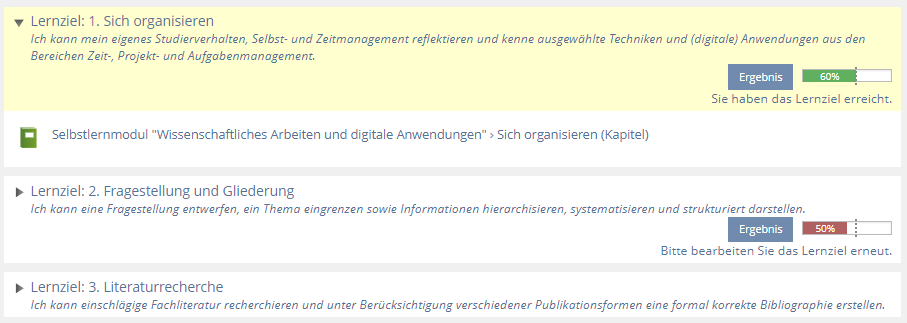In diesem Kurs wird jedem Lernziel ein Lernmodulkapitel zugeordnet. Diese Liste kann um beliebig viele Objekte ergänzt werden. Einzelne Objekte können auch mehreren Lernzielen zugeordnet werden. Wenn gezielt Kapitel einem Lernziel zugeordnet werden, wird dies in der Anzeige des Lernmoduls hervorgehoben.
