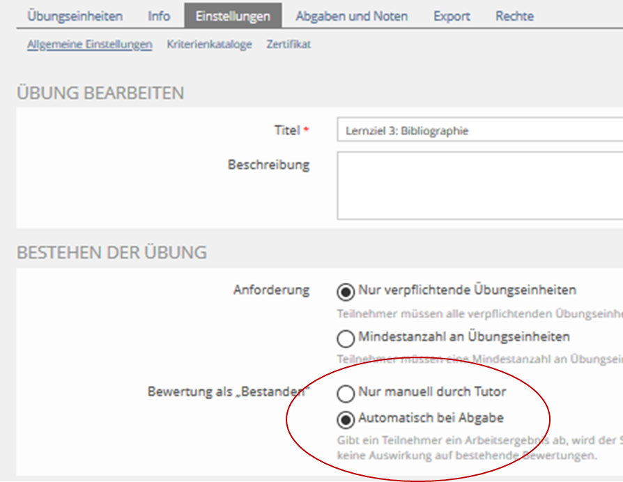 - Bestehehensbedingung in den Reflexionsübungen auf "automatisch bei Abgabe bestanden" setzen, damit die Vorbedingung des Bestehens ohne Moderation erfüllt wird.