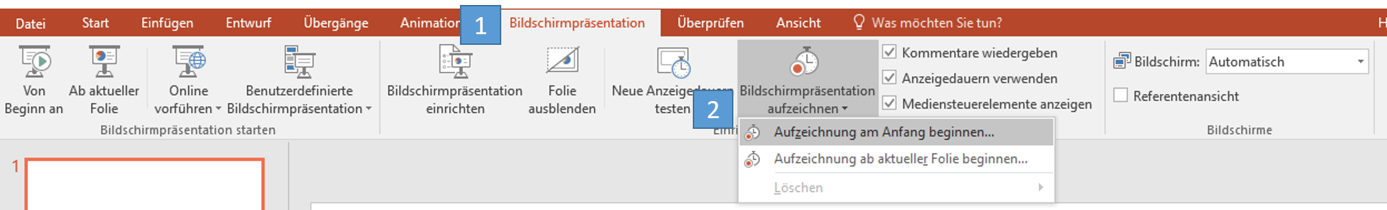 Zeichnen Sie Ihre Vorlesung mit Powerpoint auf. Wählen Sie hierzu im Reiter "Bildschirmpräsentation" die Option "Bildschirmpräsentation aufzeichnen".
