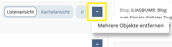 Über das Aktionsmenü können Sie mehrere Objekte entfernen, um Ihr Dashboard aufzuräumen. Einzeln geht dies auch jeweils über das Aktionsmenü hinter dem Titel des Objekts. Sie bleiben weiterhin Mitglied bzw. Admin dieser Kurse, sie liegen nur nicht mehr auf dem Dashboard. Über Meine Kurse und Gruppen sind sie weiterhin erreichbar.