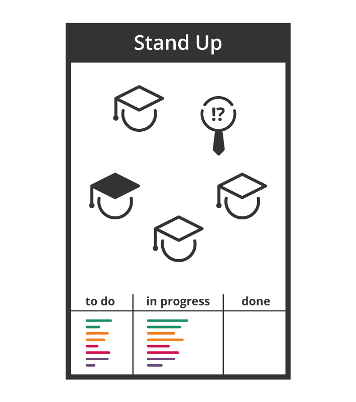 Das Stand Up wird (mindestens) einmal wöchentlich eigenverantwortlich durch das Team durchgeführt. Das Team stellt sich im kreis auf und jedes Teammitglied berichtet kurz und knapp