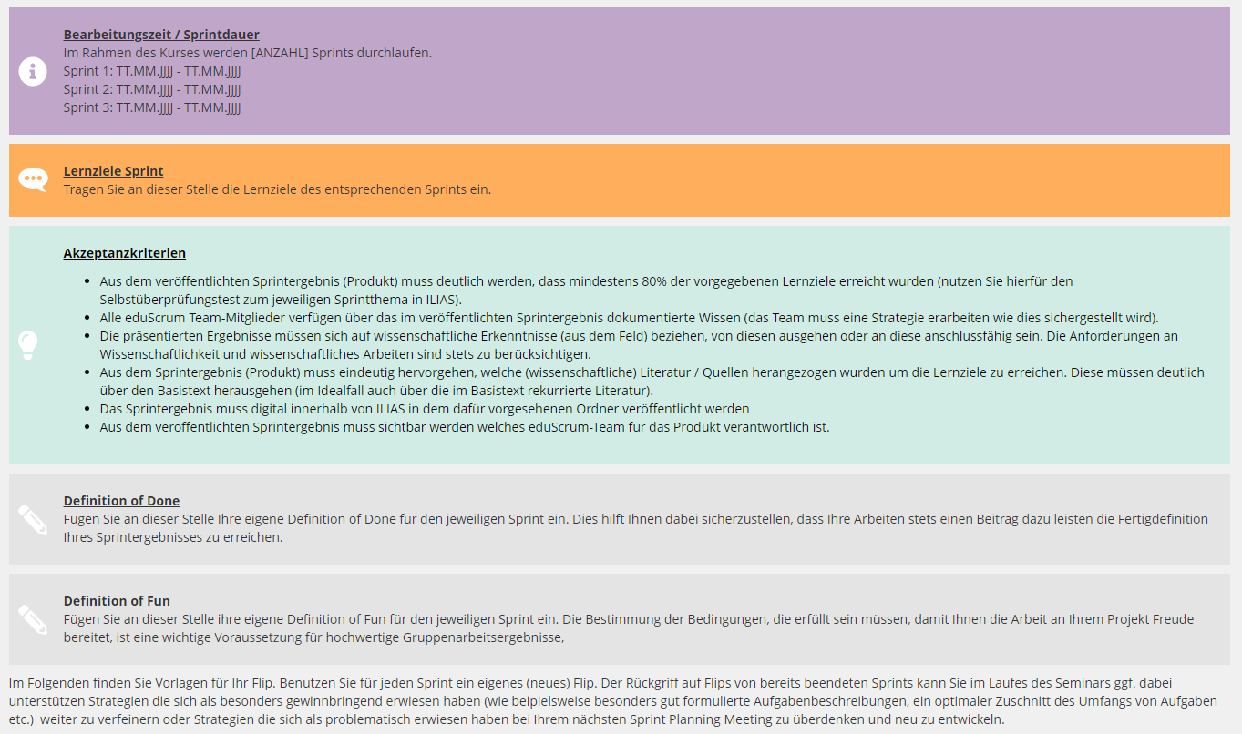 Dabei handelt es sich ausschließlich, um Hinweise zur Nutzung von digitalen Tools zum Zweck des kooperativen Arbeitens in ILIAS. Alle Informationen zu Ablauf und Funktionen der eduScrum Ereignisse können dem eduScrum Wiki entnommen werden.